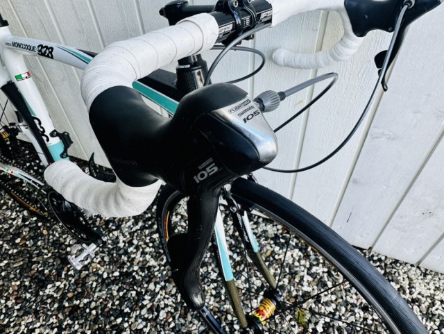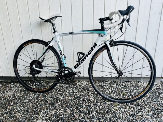 Denne hvite Bianchi Carbon Monocoque landeveissykkelen med Bianchis særegne turkise detaljer er en klassisk italiensk racersykkel med mange karbondeler og gode komponenter – klar for både trening, lengre turer og ritt.