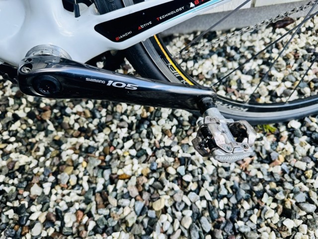 Pedaler: Shimano klikkpedaler (se bilde for klikkløsning) – kan brukes med vanlige sko og byttes enkelt ved behov