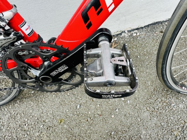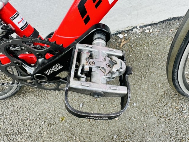 Pedaler: Shimano kombipedaler – vanlige sko på ene siden, klikkpedaler på andre siden (se bilde for klikkløsning) – kan enkelt byttes ved behov