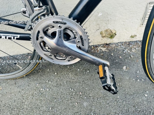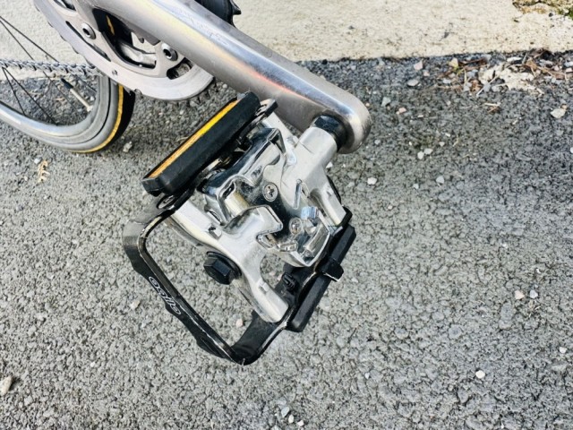 Pedaler: Shimano kombipedaler – vanlige sko på ene siden, klikkpedaler på andre siden (se bilde for klikkløsning) – kan enkelt byttes ved behov